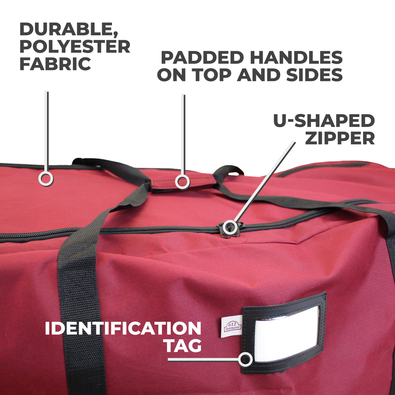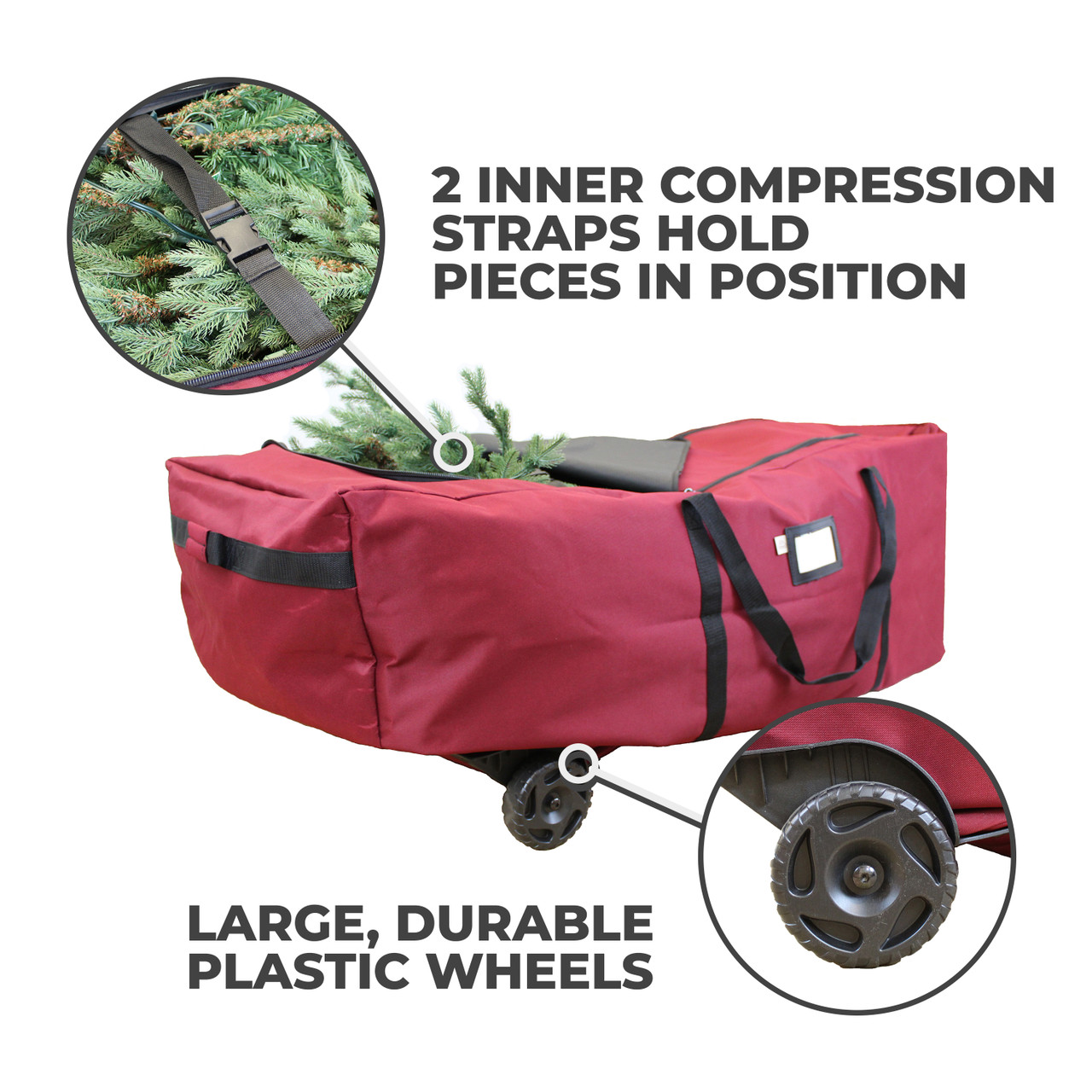 This rolling tree bag makes storing your Christmas tree a cinch. The large capacity holds trees up to 9 feet tall. No more hassling with old cardboard boxes that have no where to grip the tree. This patent-pending design has large wheels and a tapered end to prevent drag when moving the bag in and out of storage. We have made this tree storage bag to be tough and resilient so that it will last many, many years! The durable, woven material is puncture resistant, and the sewn-in padded handles make moving the bag more comfortable. Designed in the USA, made in China.