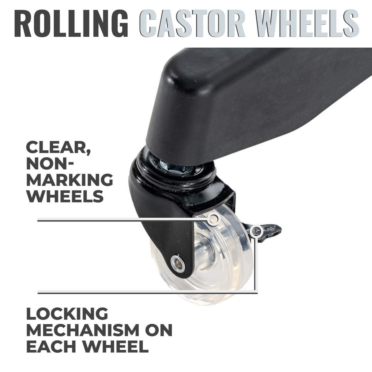 - LOCKING CASTOR WHEELS: Clear, scratch-resistant wheels.