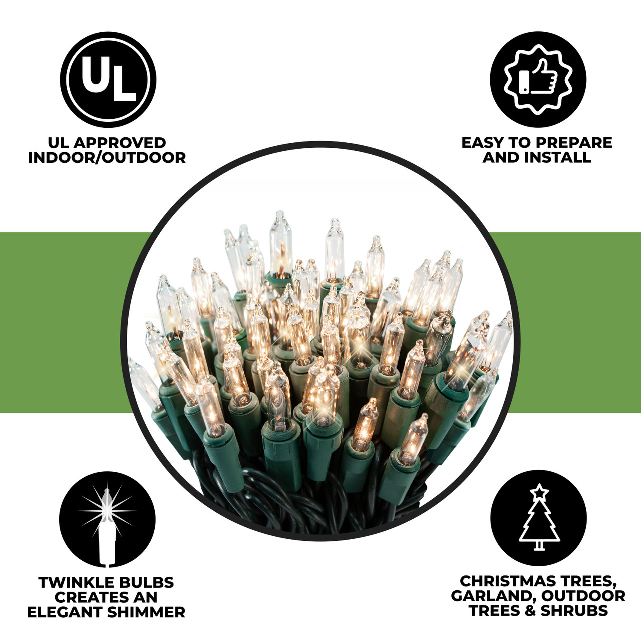 These old-fashioned twinkle lights provide the perfect shimmering effect to your decoration. As with most twinkling light set, only 12 light bulbs twinkle and they are scattered around the entire set of 100 lights. The result is a soft twinkling effect that creates just a little bit of movement and really brings a light display to life! These clear lights are on green wire, so they blend well on artificial or live green. UL approved for both indoor and outdoor use.