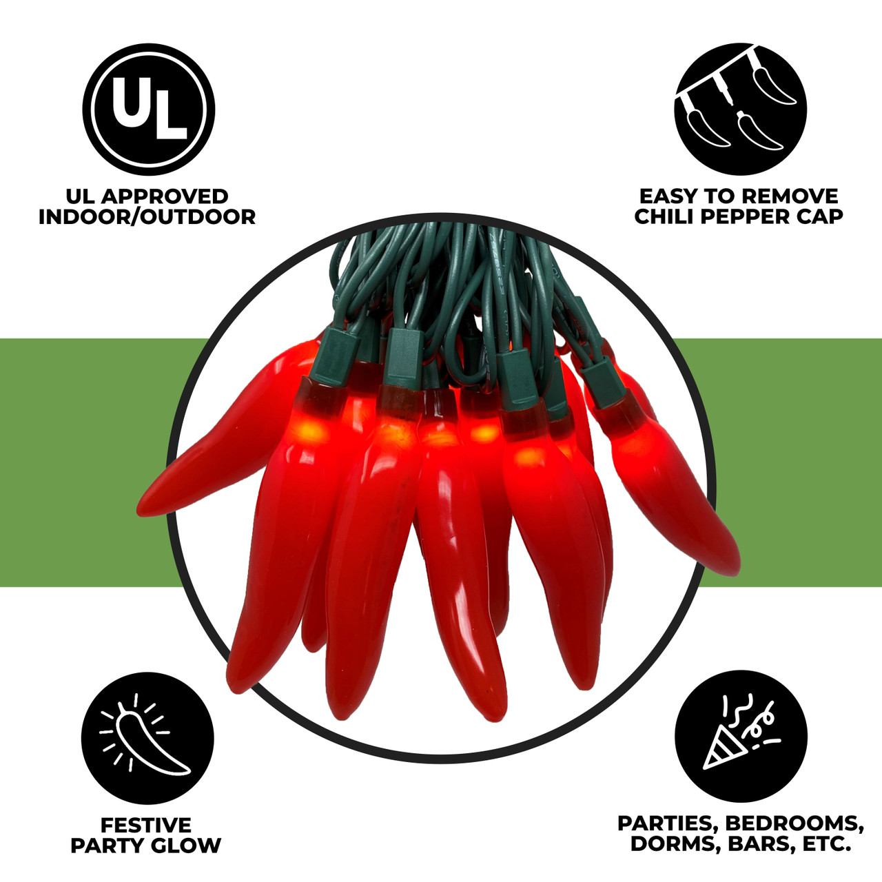 Chili pepper lights create a festive look anywhere they are placed. Great for parties, Cinco de Mayo, pergola, dorm rooms, bars, barbecue areas, and more. Each strand has 35 lights and they are end-to-end connectable, so you can link them together to create a large display. This set has 35 red chili lights on green wire. UL approved for both indoor and outdoor use.