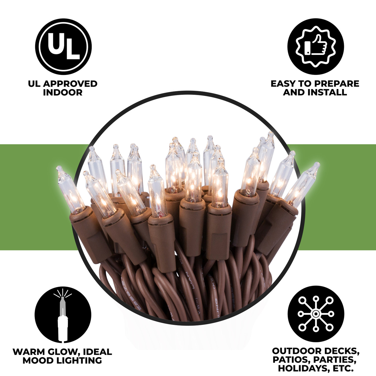 Brown wire string lights provide a rustic feel and blend well against any type of dark surface. We love to use these lights when decorating bare branch trees outside, or along wooden mantles by the fireplace, or even intermingled with grapevine decorations! Not sure if these lights will work for you... Here are some of the specifics: