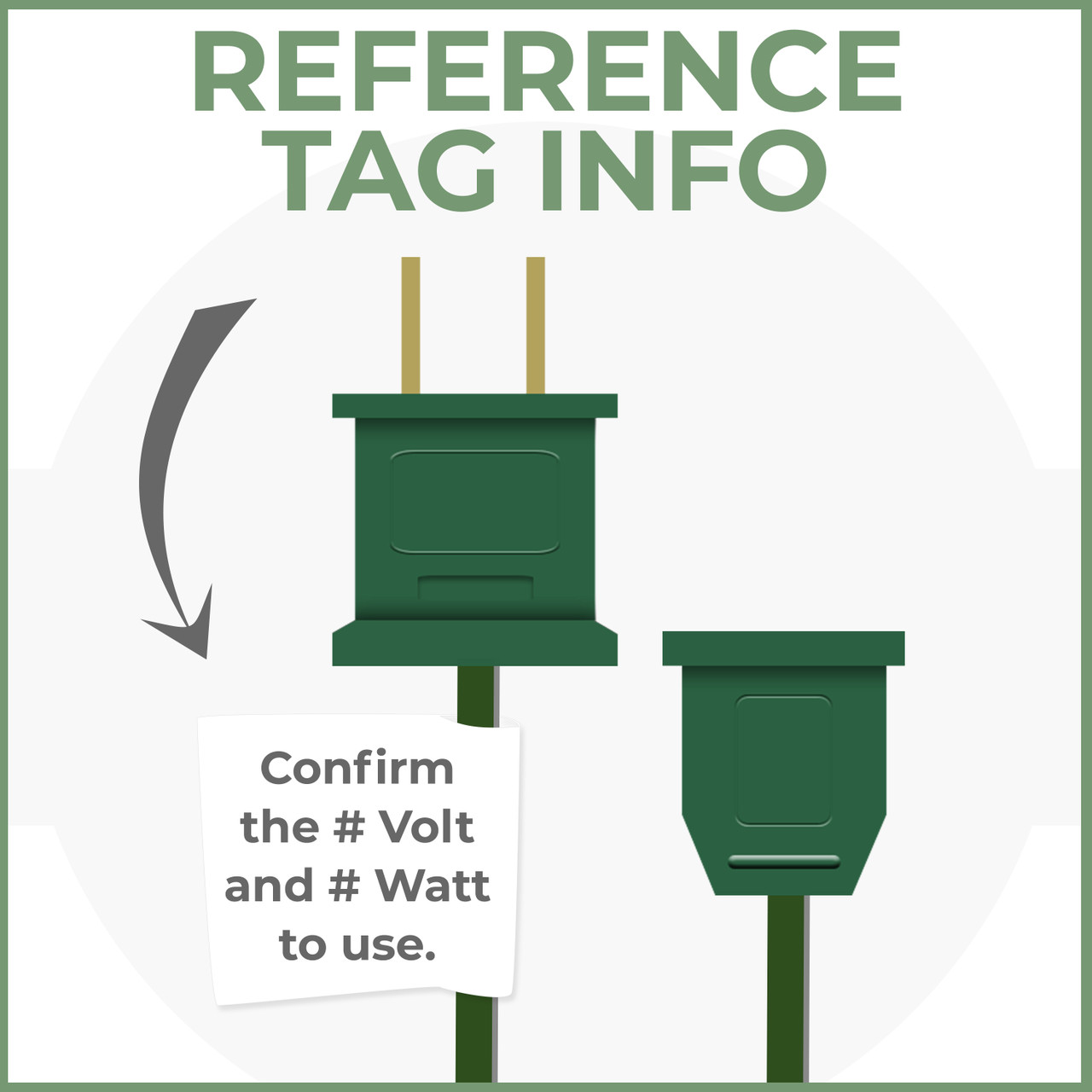 Please be sure to reference the tag near the male plug on your light set to confirm both the voltage and the wattage for your string. Voltage, amperes, and wattage must all match the following bulb specifications: 12 volt, 80 mA, 0.96 watt.
