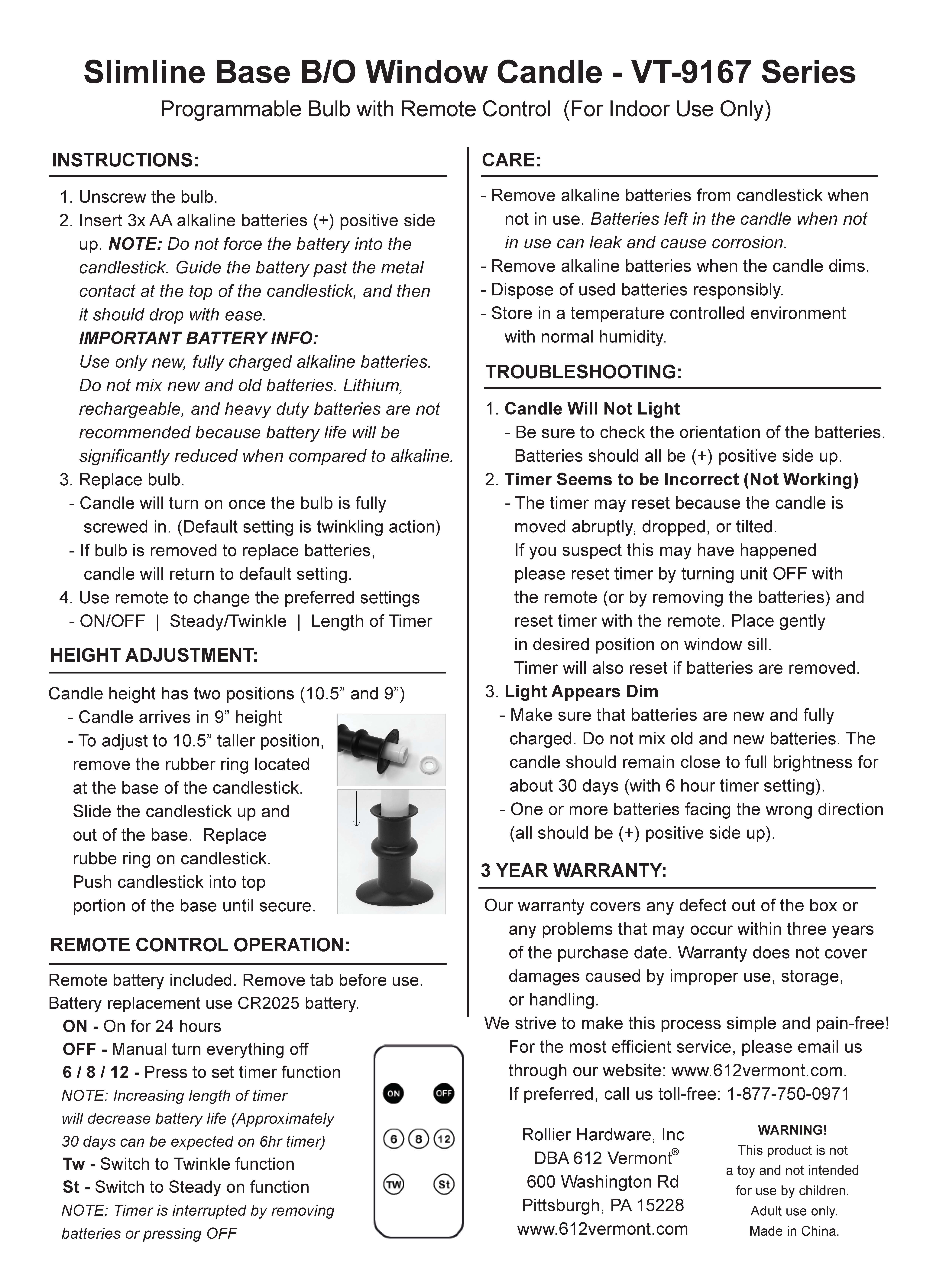 This feature-rich battery-operated window candle is our new premium window candle option. Featuring the same dual-intensity LED bulb that so many of our customers love in our VT-1524 ultra-bright series, we guarantee that this candle will be bright from the street. Now, with the included remote control, you may choose your light setting, either twinkle or steady-on. You may also change your daily timer setting to be either 6 hours, 8 hours, or 12 hours ON. Each candlestick features a slim design metal base that is perfect for narrow windowsills since it measures only 1.5 inches deep! Made in Taiwan. For indoor use only.