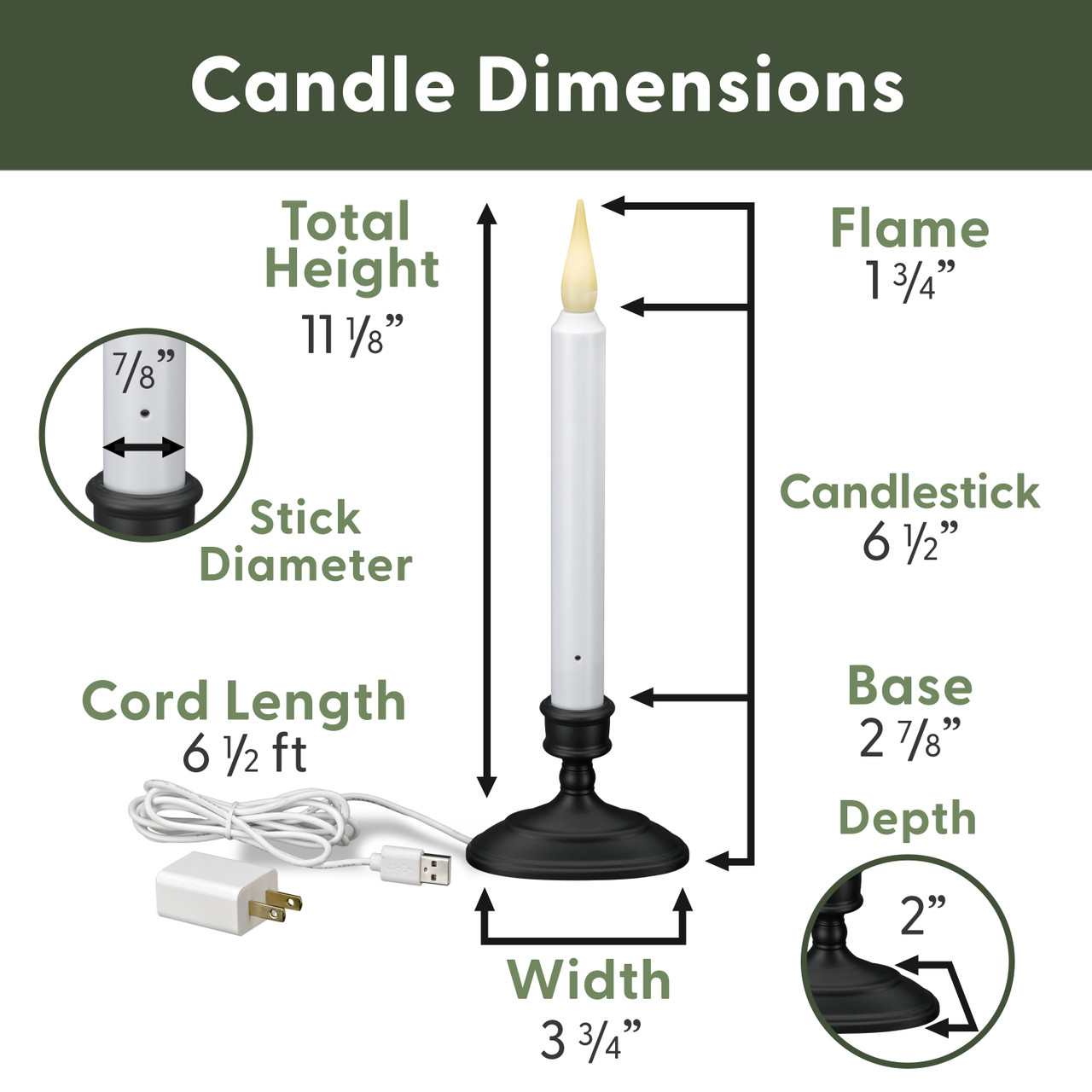 Choose from 2 ON settings (realistic flicker or steady-on). The patented flickering action is the same as several other candles in our line-up. Thanks to dual-LEDs in the flame tip, there is no abrupt jumping of the flame intensity.  Simply place in your windows and connect to a power source. Included with each candle is one USB power adapter and a long, 6.5 foot cord. Candles have a built-in, automatic sensor that turns the candle ON at dusk and OFF at dawn. This is a great option for year-round use thanks to this feature!