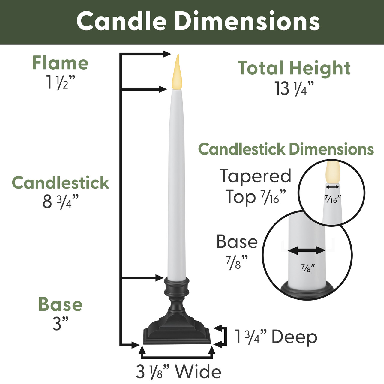 - Candlestick Diameter: 7/8” at the bottom and narrows to 7/16” at the top