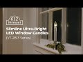 This candle offers many of the same features of our original ultra bright window candle, but with a slender "slimline" metal base. Base only measures 1.5" deep and is weighted to prevent tipping. Available in four finishes. Requires 3 AA batteries, which typically last 30 days (6 hours each day). Made in Taiwan. For indoor use only.