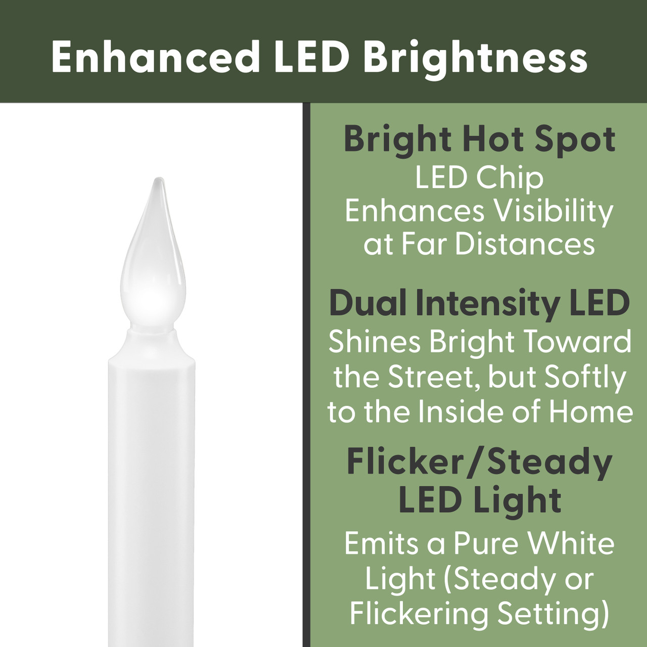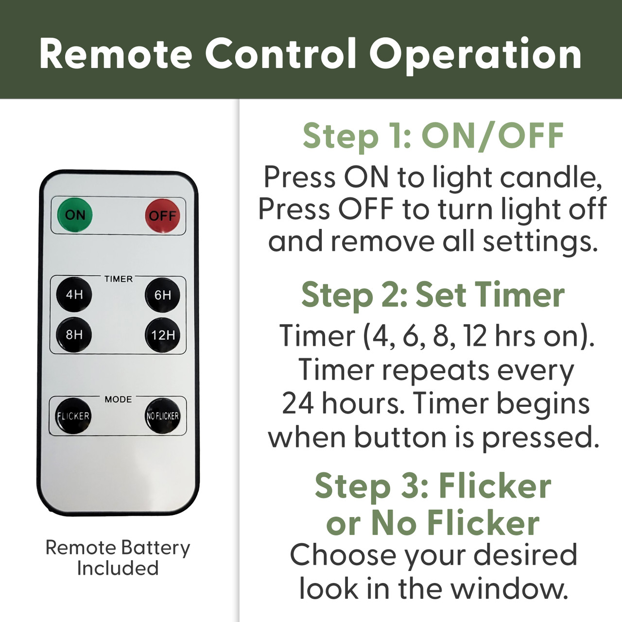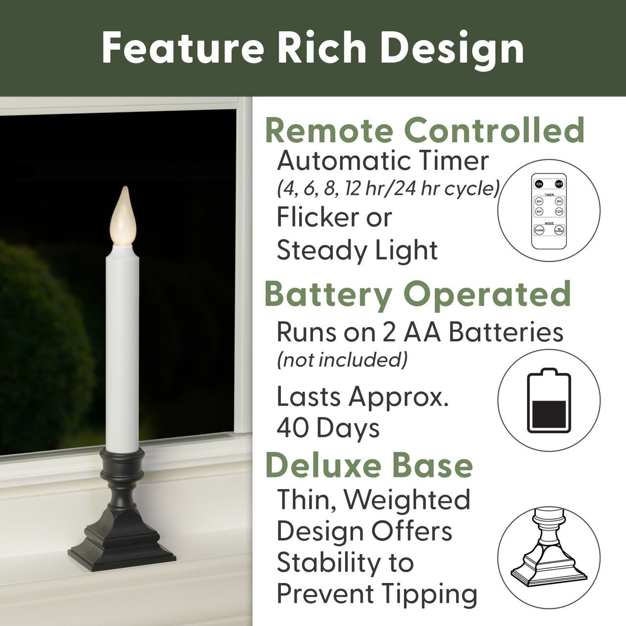 This feature packed window candle has it all! Our bright white LED hot spot shines strongly to the outside of your home while shining softly to the inside. The remote version of our 1506 candle offers both steady and flicker settings as well as an automatic timer that can be set to 4, 6, 8, or 12 hours on per 24-hour cycle (repeats daily). Our custom-molded weighted base provides an elegant look to the whole candle as well as a sturdy base to prevent tipping over.