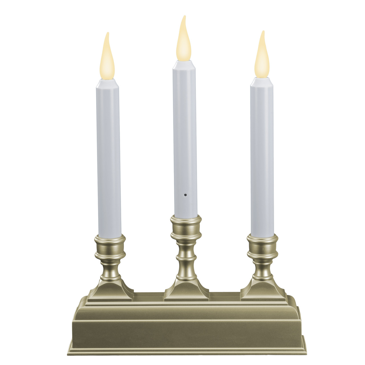 New for 2021, this 3-light candelabra offers the same features of our beloved VT-1620 series single candles, but as a 3 light option! Great for larger windows where a single candle is just not enough. Flame tips have two settings, either realistic flicker or steady-on. Warm white color. Made in China. For indoor use only.