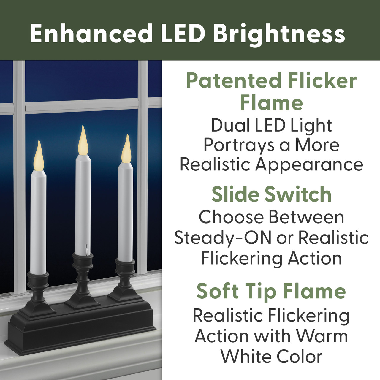 - PATENTED WARM WHITE LED: Choose from a realistic flicker and steady lighting options.