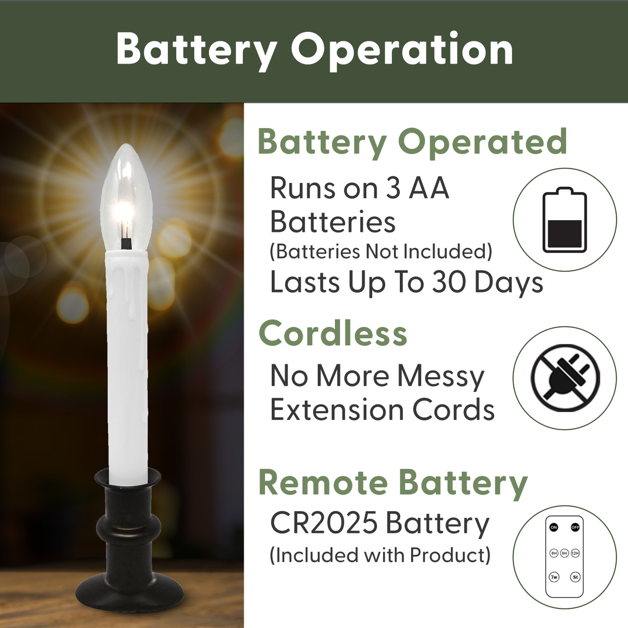 - REPLACEMENT BULBS: Replacement bulbs for this remote-controlled window candle are available, you can view and purchase them here.