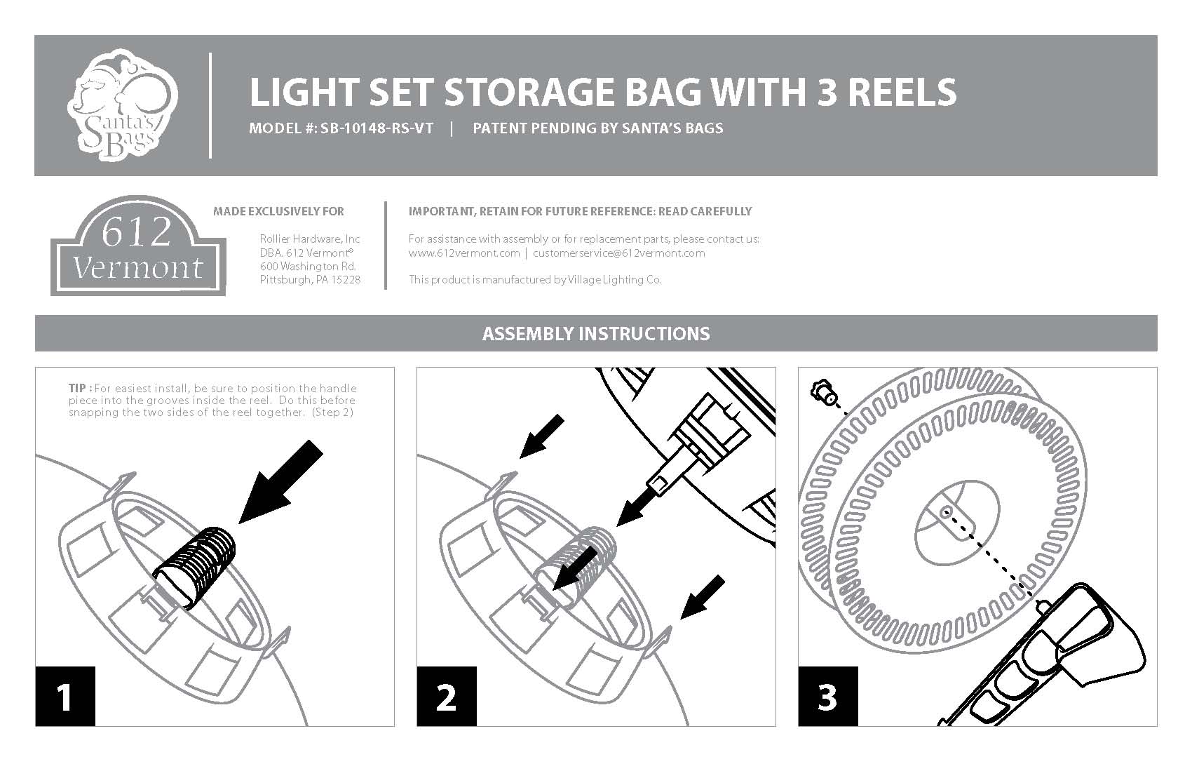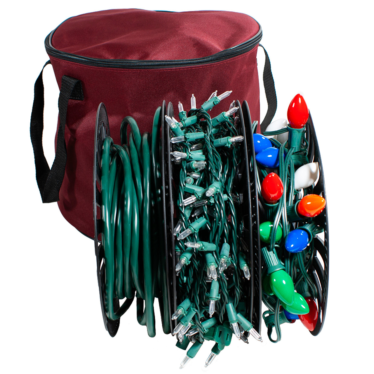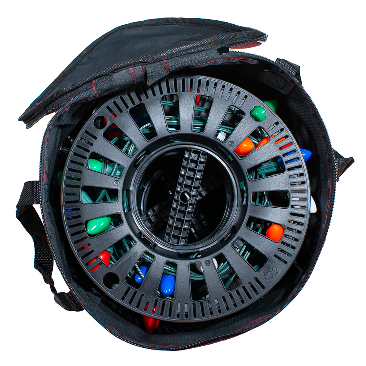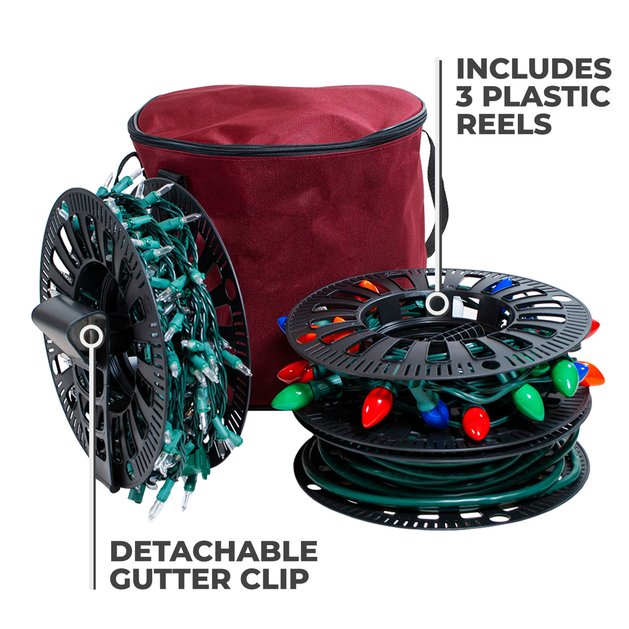 This unique Christmas light storage bag includes 3 reels and a patented versa clip. The 3 large storage reels combine to hold up to 125 feet of mini lights! The convenient Versa clamp on the one side allows you to clip the reel to a rain gutter or ladder to assist with install. Because you wrap the lights on a reel, your lights will never become a big knot (aka. National Lampoons Christmas Vacation). The 3 storage reels fit nicely inside a protective polyester bag. Designed in the USA, made in China.