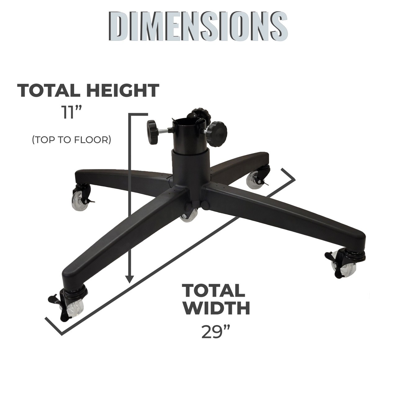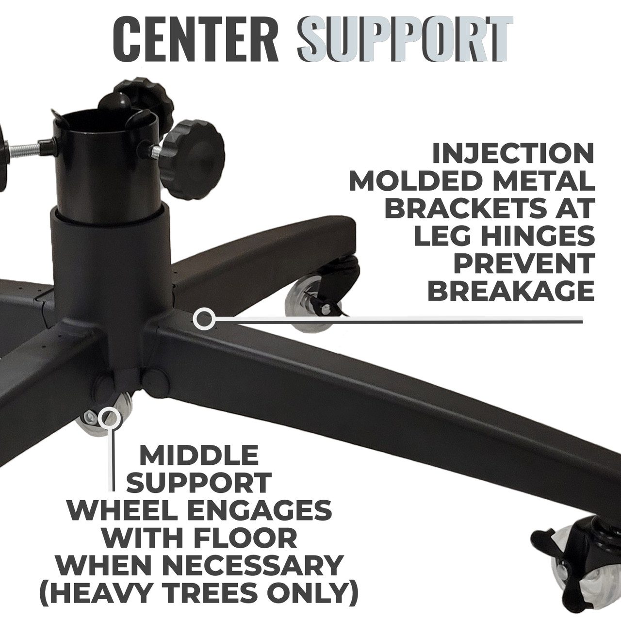 - HEAVY DUTY CONSTRUCTION: Metal injection brackets built into the stand at the hinge points to ensure stability of the legs with trees up to 9' and 220lbs. Center wheel will engage with the floor if tree is heavy enough to need