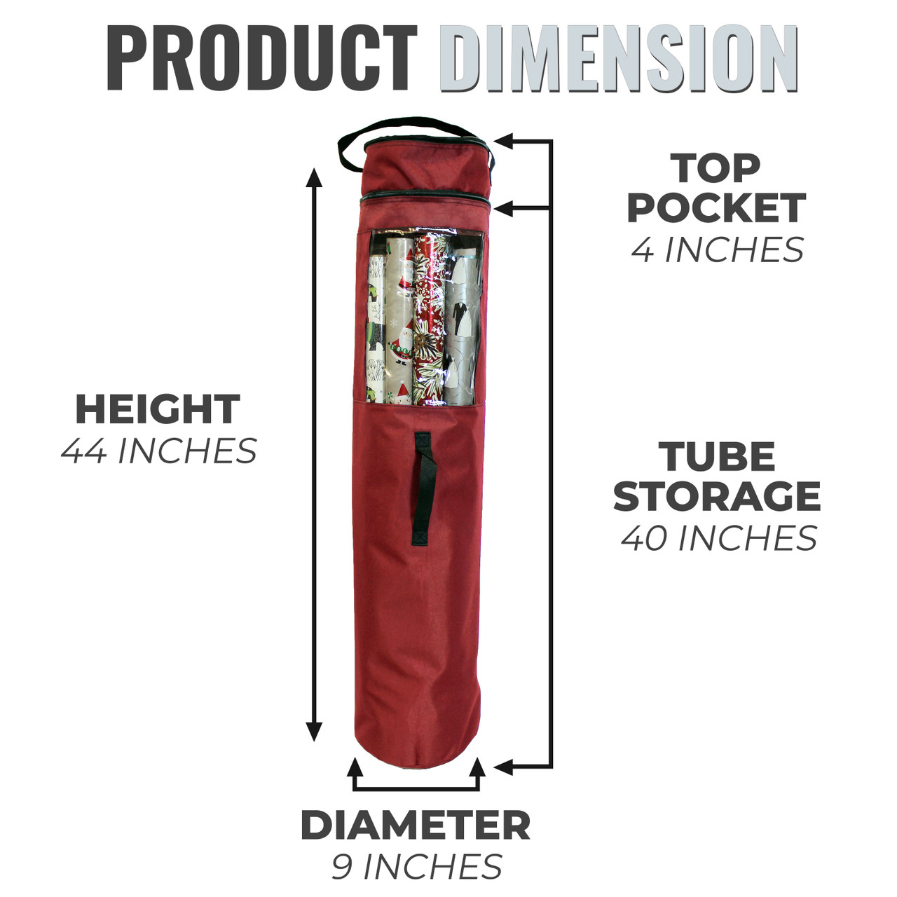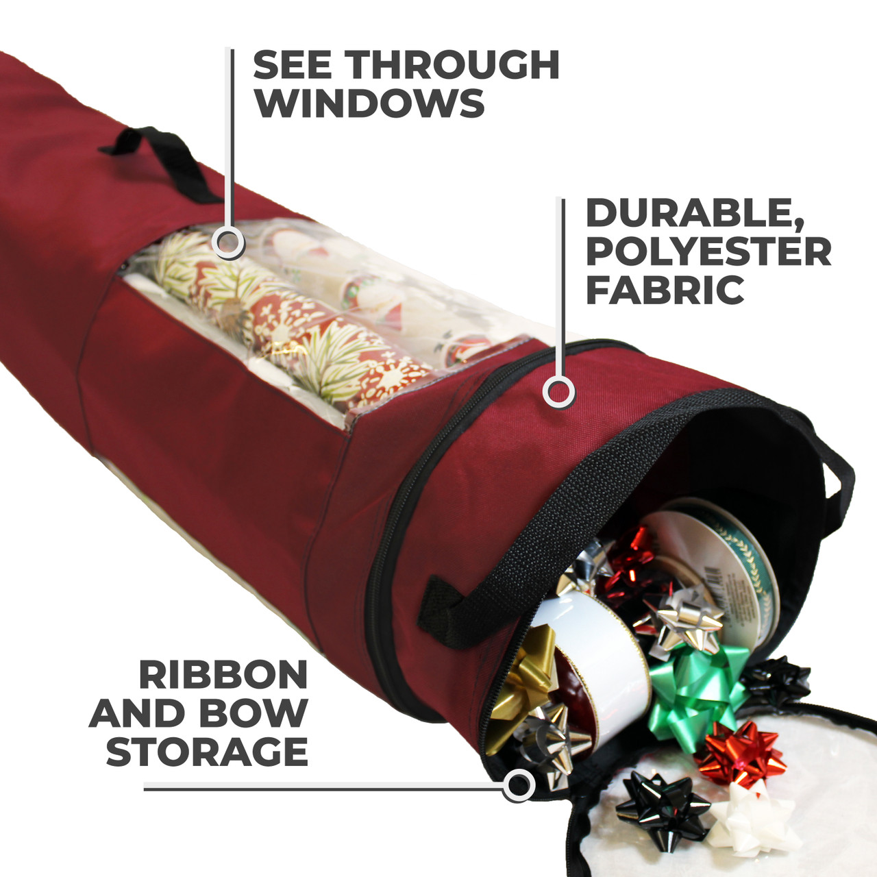 This wrapping paper storage bag holds 12 rolls of wrapping paper, up to 40" long. The main compartment has 2 clear see-through window that lets you peek inside both the front and back. At the top, there is a 4" accessory compartment that works great for ribbons, bows, tape, scissors and more. Made from durable, polyester material, this bag resists water and dust and will keep your wrapping paper clean and organized! Designed in the USA, made in China.