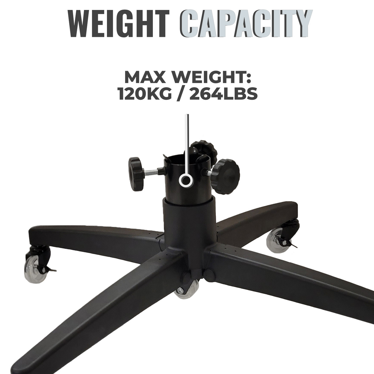 Our metal rolling tree stand is an upgrade over our plastic rolling tree stand (TK-10828-VT). Our metal rolling tree stand can support up to a 12 foot tall Christmas tree. The stand features adjustable legs, 2 locking wheels and and collar that will receive and hold tree stand posts from 1.25" to 2.125". Once the tree post is inserted into the collar, simply tighten down the wide metal collar bands to secure your Christmas tree. Our non-scratch wheels allow for safe, worry free moving of your Christmas tree into it's final position. Our metal Christmas tree stand is a great fit for homeowners and commercial properties.