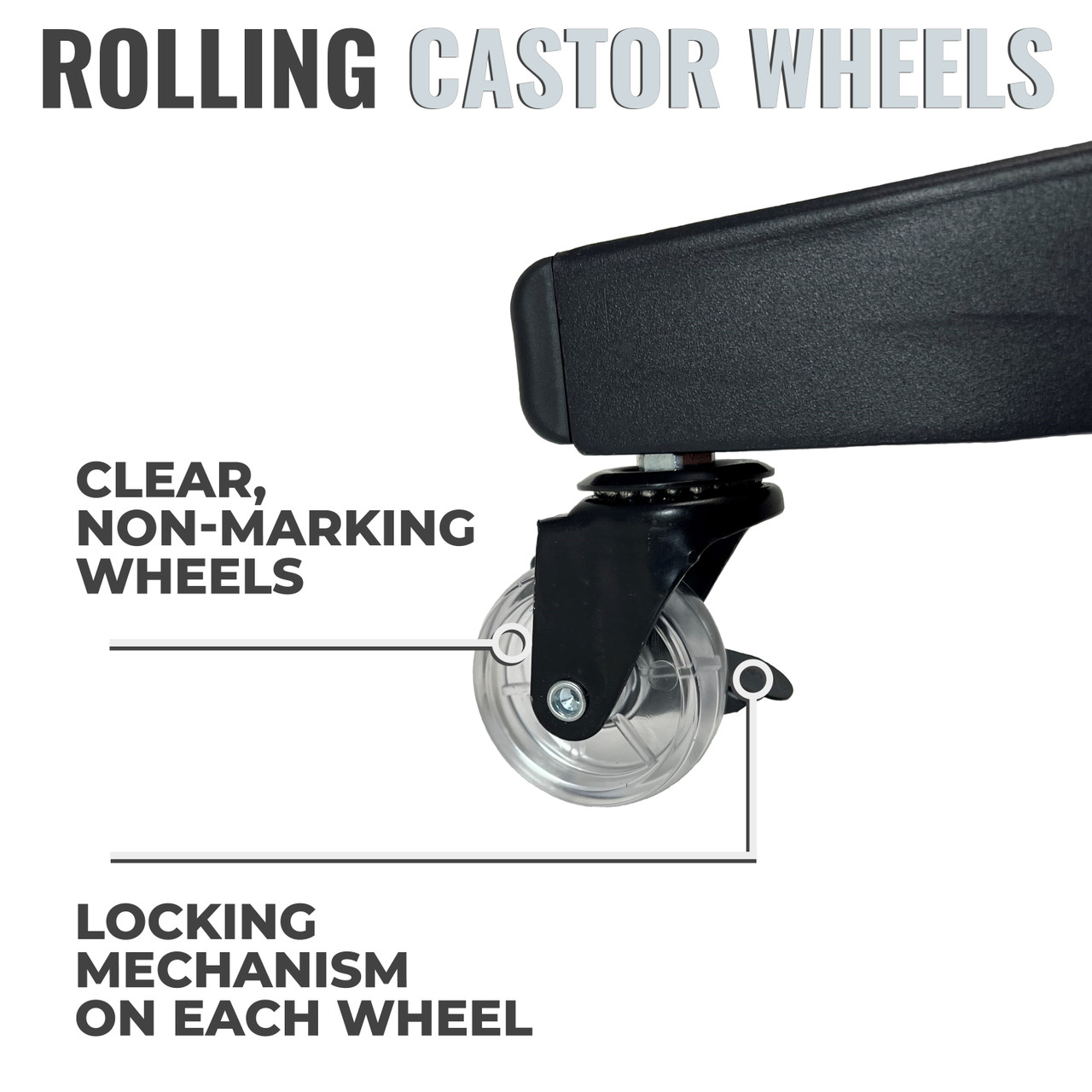 - LOCKING CASTOR WHEELS: Clear, scratch-resistant wheels.