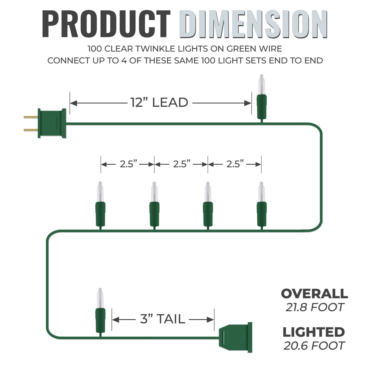 These old-fashioned twinkle lights provide the perfect shimmering effect to your decoration. As with most twinkling light set, only 12 light bulbs twinkle and they are scattered around the entire set of 100 lights. The result is a soft twinkling effect that creates just a little bit of movement and really brings a light display to life! These clear lights are on green wire, so they blend well on artificial or live green. UL approved for both indoor and outdoor use.