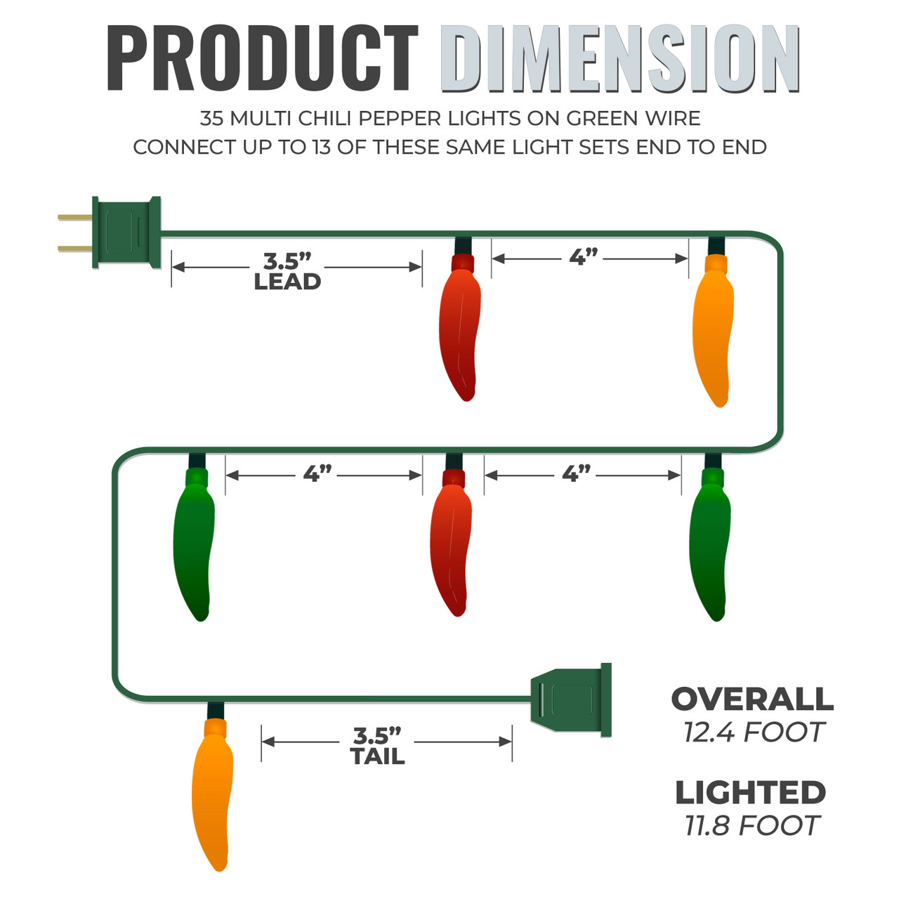 Chili pepper lights create a festive look anywhere they are placed. Great for parties, Cinco de Mayo, pergola, dorm rooms, bars, barbecue areas, and more. Each strand has 35 lights and they are end-to-end connectable, so you can link them together to create a large display. This set has 35 multi chili lights on green wire. Multi assortment includes red, green, and yellow chilis. UL approved for both indoor and outdoor use.