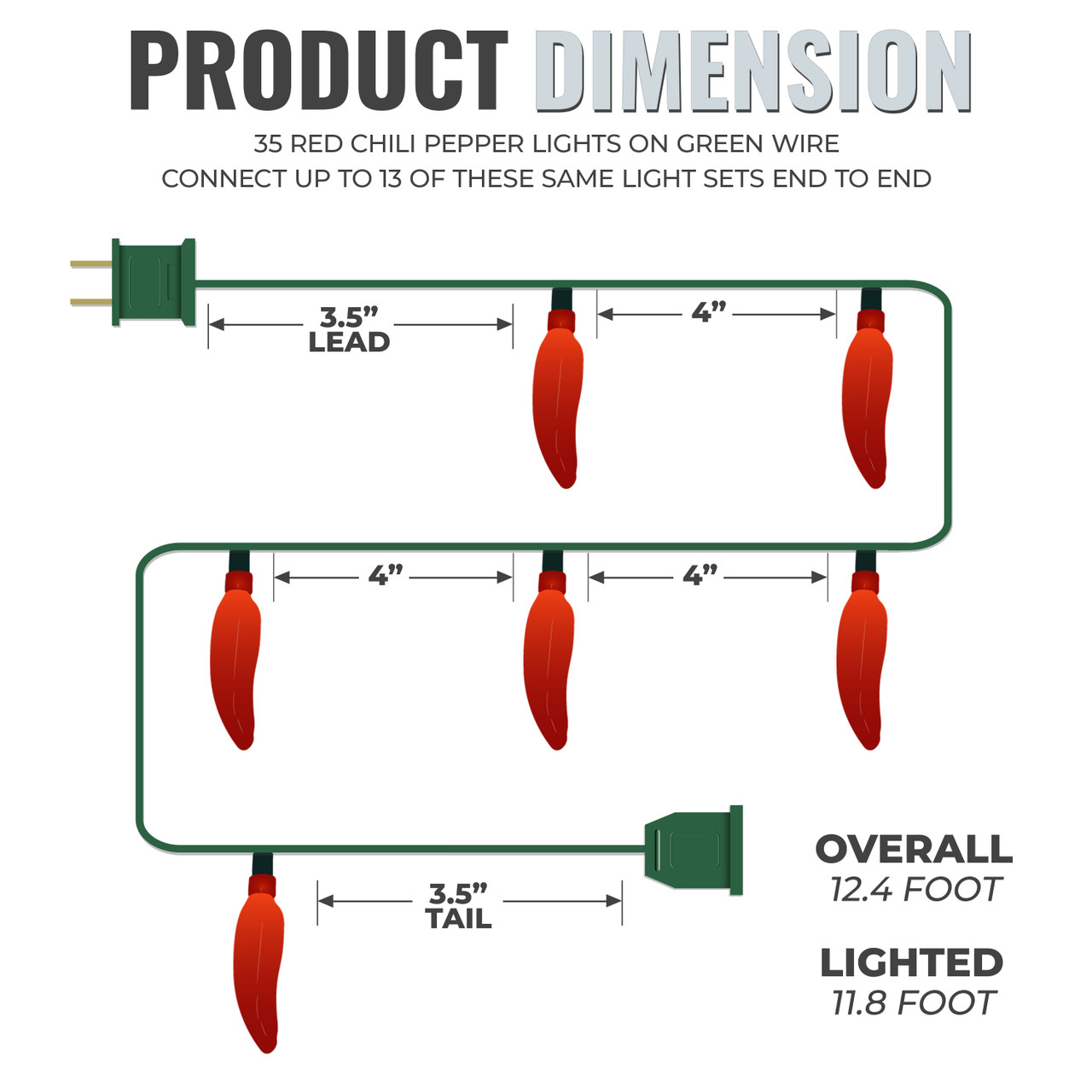 Chili pepper lights create a festive look anywhere they are placed. Great for parties, Cinco de Mayo, pergola, dorm rooms, bars, barbecue areas, and more. Each strand has 35 lights and they are end-to-end connectable, so you can link them together to create a large display. This set has 35 red chili lights on green wire. UL approved for both indoor and outdoor use.
