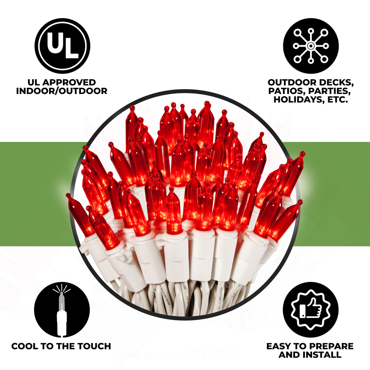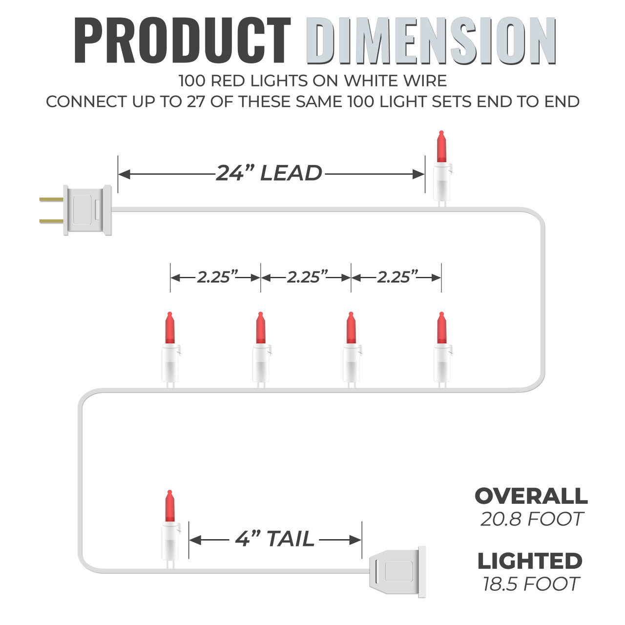 100 Red LED Christmas Lights on White Wire, UL Approved for Indoor/Outdoor Use, 18.5' Lighted Length, 20.8' Total Length