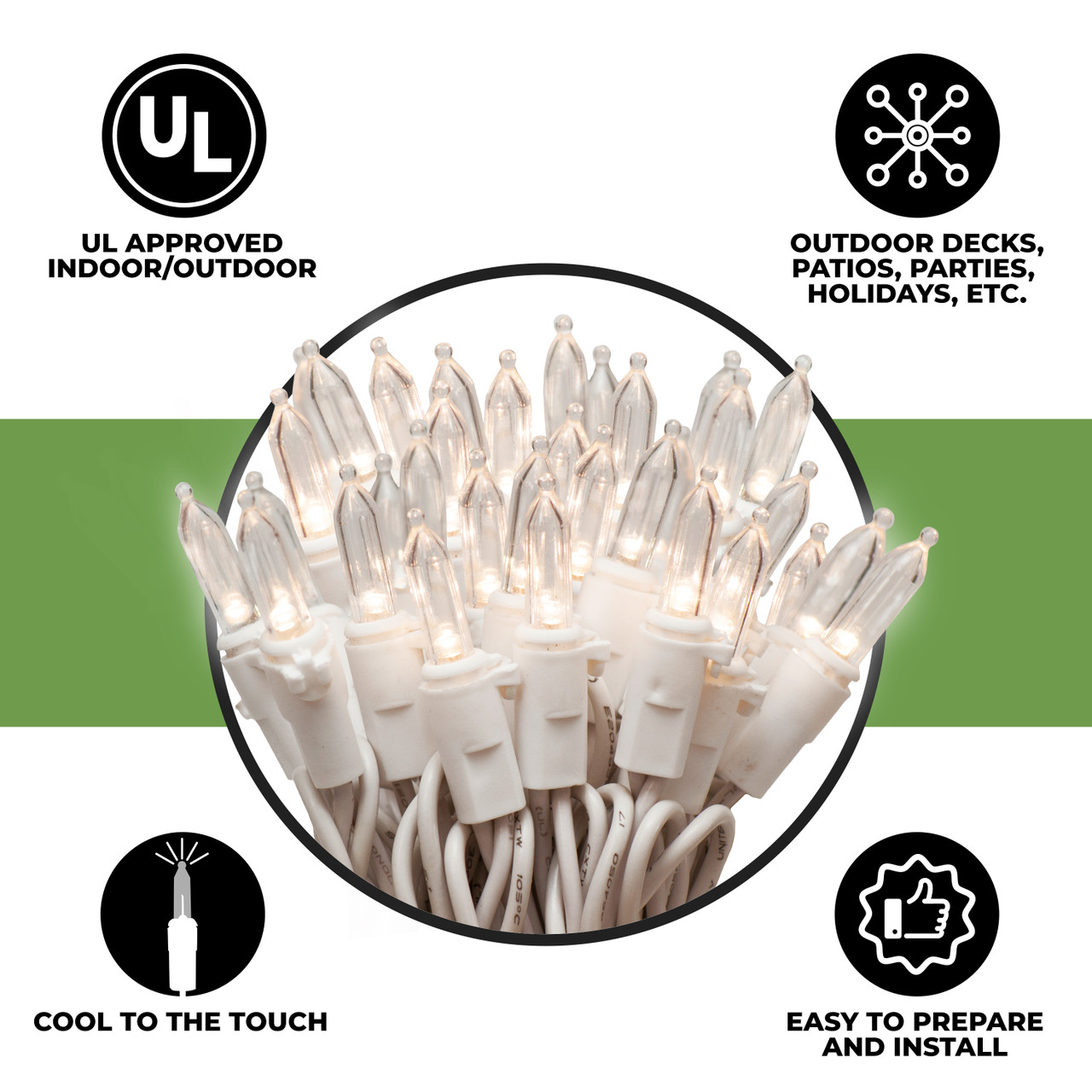 This LED string light is a beautiful and more energy efficient option to traditional Christmas string lights. The white strings are perfect to use when decorating around white surfaces indoors, such as ceilings, crown molding, mantles and snow-flocked items. They are also great for hiding wire against light colored surfaces outside, such as gutters, house trim, wedding tents and more. We love these clear lights as a wedding, holiday, or everyday decoration!