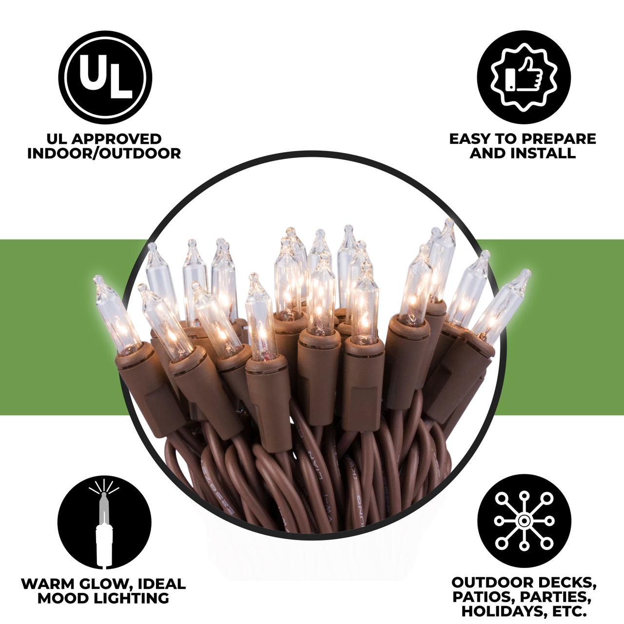 Brown wire string lights provide a rustic feel and blend well against any type of dark surface. We love to use these lights when decorating bare branch trees outside, or along wooden mantles by the fireplace, or even intermingled with grapevine decorations! Not sure if these lights will work for you... Here are some of the specifics: