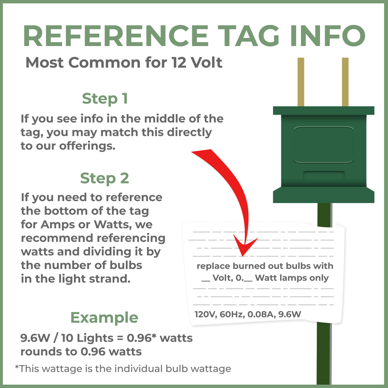 Please be sure to reference the tag near the male plug on your light set to confirm both the voltage and the wattage for your string. Voltage, amperes, and wattage must all match the following bulb specifications: 12 volt, 80 mA, 0.96 watt.