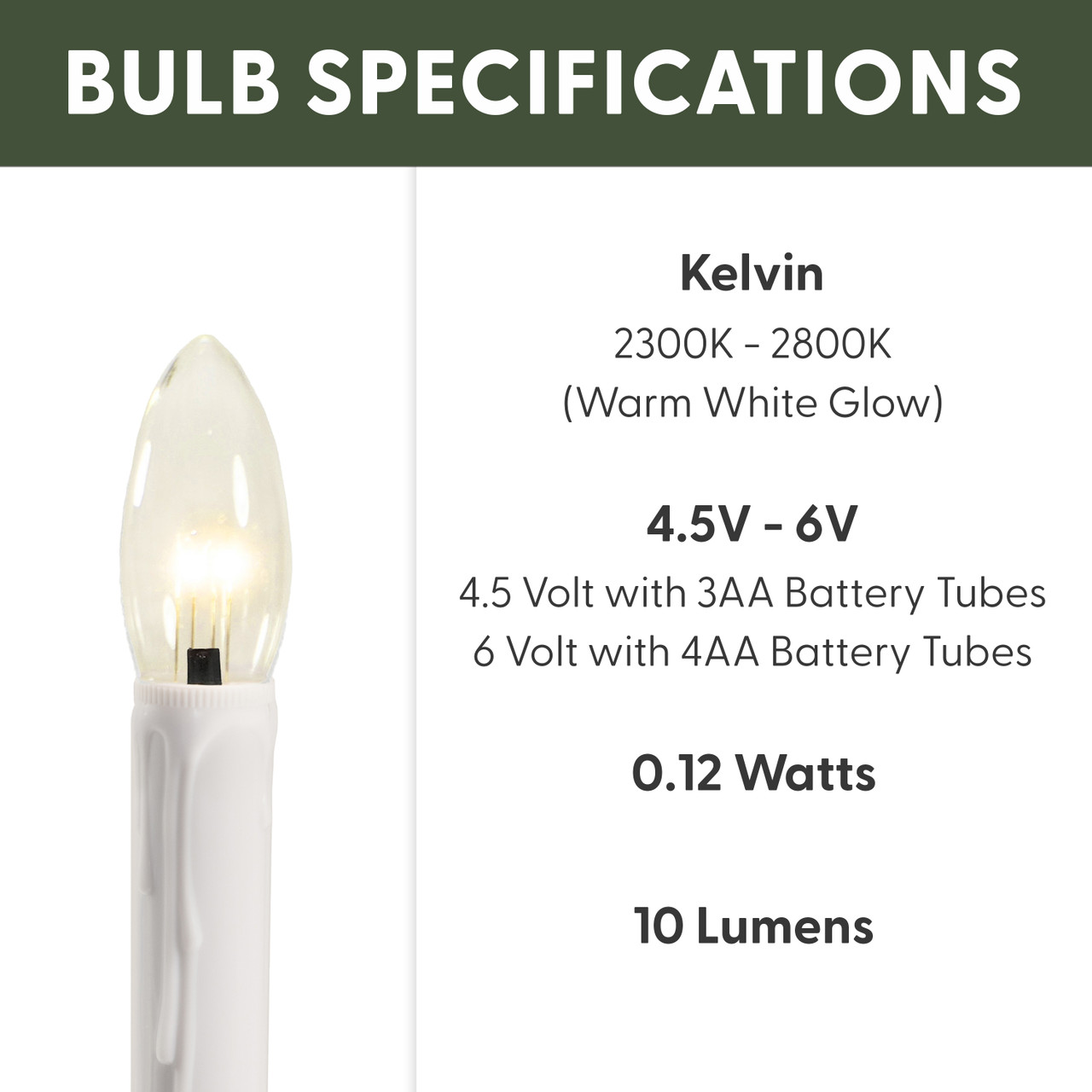 Pack of 4 replacement bulbs for our Slimline Ultra-Bright LED Window Candles with Remote Control (9167 series). These programmable bulbs are the exact replacements and include the micro-chip that controls the timer and LED light function of the candle. If you have a broken bulb or if the timer functionality is not working properly with your candles, then we suggest these replacement bulbs. PLEASE NOTE: To use the programmable bulbs you must have a remote as well. While these come with our 9167 series candle, you may use them on our 1524 series candle if you wish to.