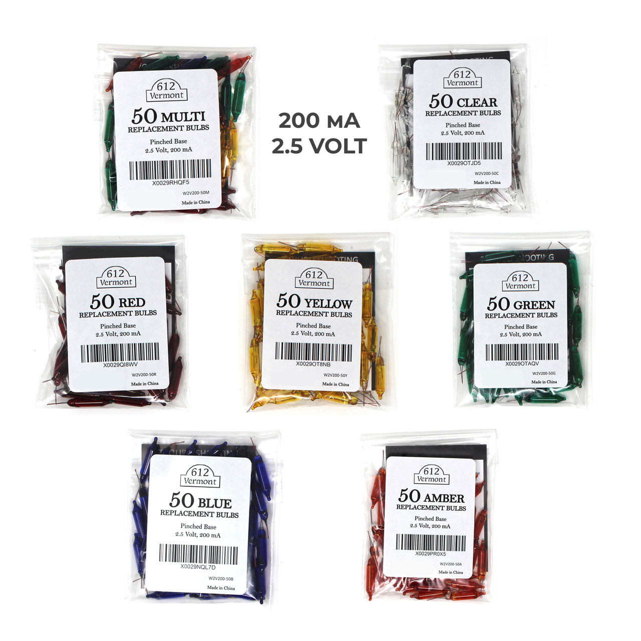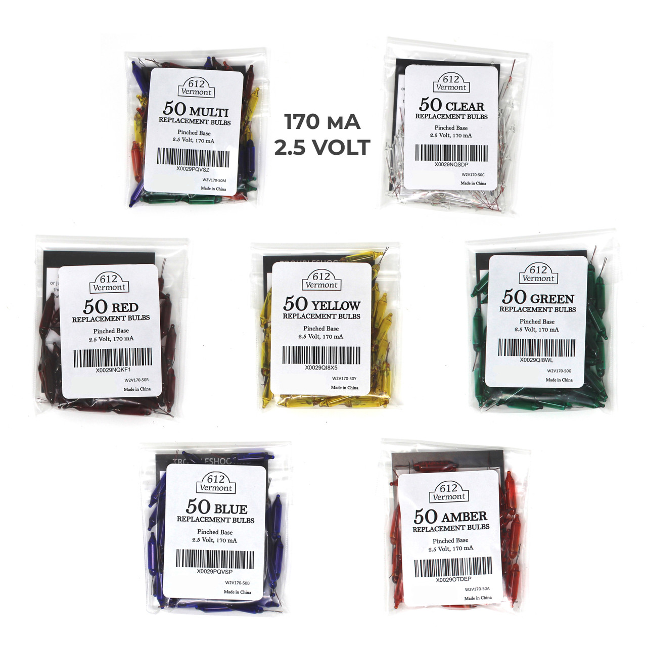 These 2.5V mini Christmas replacement bulbs for incandescent string lights are made with a pinched base which means that they will fit most light sets (whether a pinched base is required or not). 2.5V lamps are very common for string lights with 50 or more lamps, however it is very important to confirm the amperes (or wattage) for your particular light set to be sure that you get the correct brightness. We offer the following three options for 2.5 volt lamps: