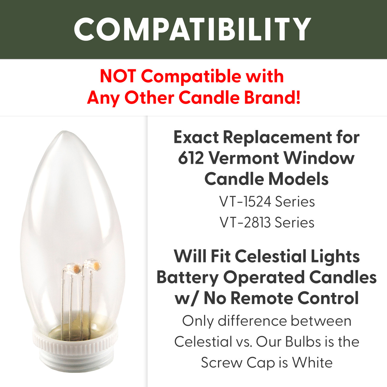 - Ultra-bright LED replacement bulbs for 612 Vermont brand candles ONLY.