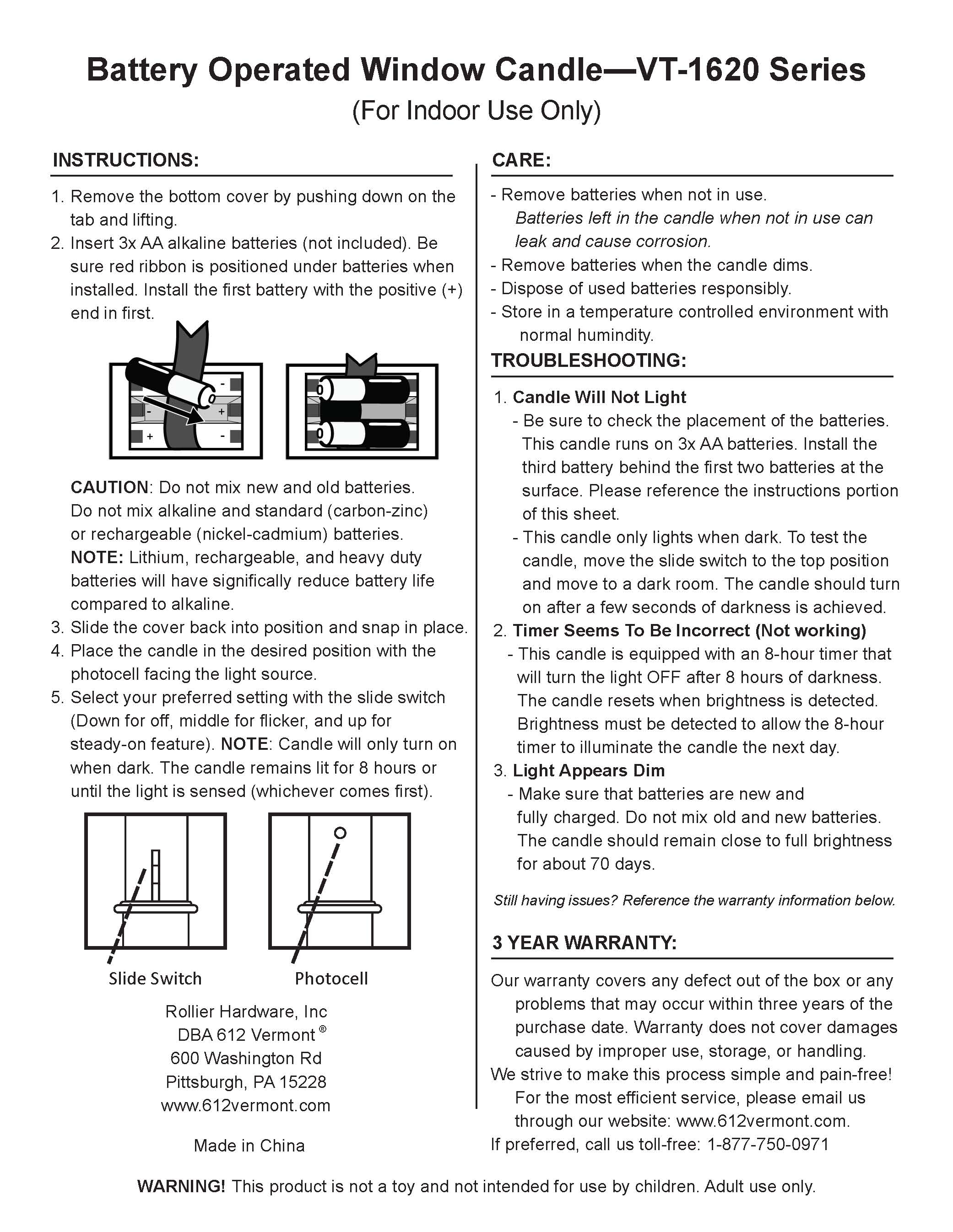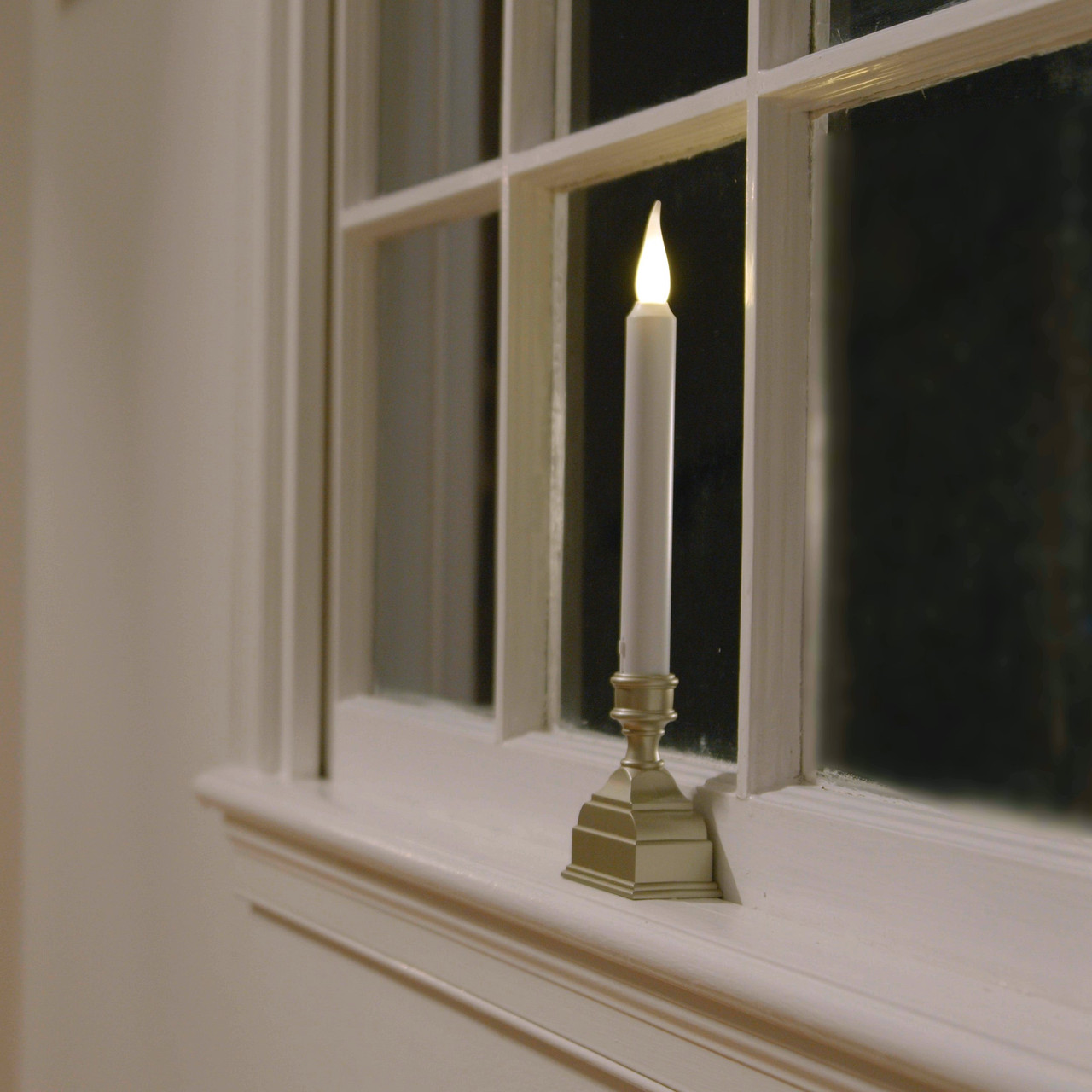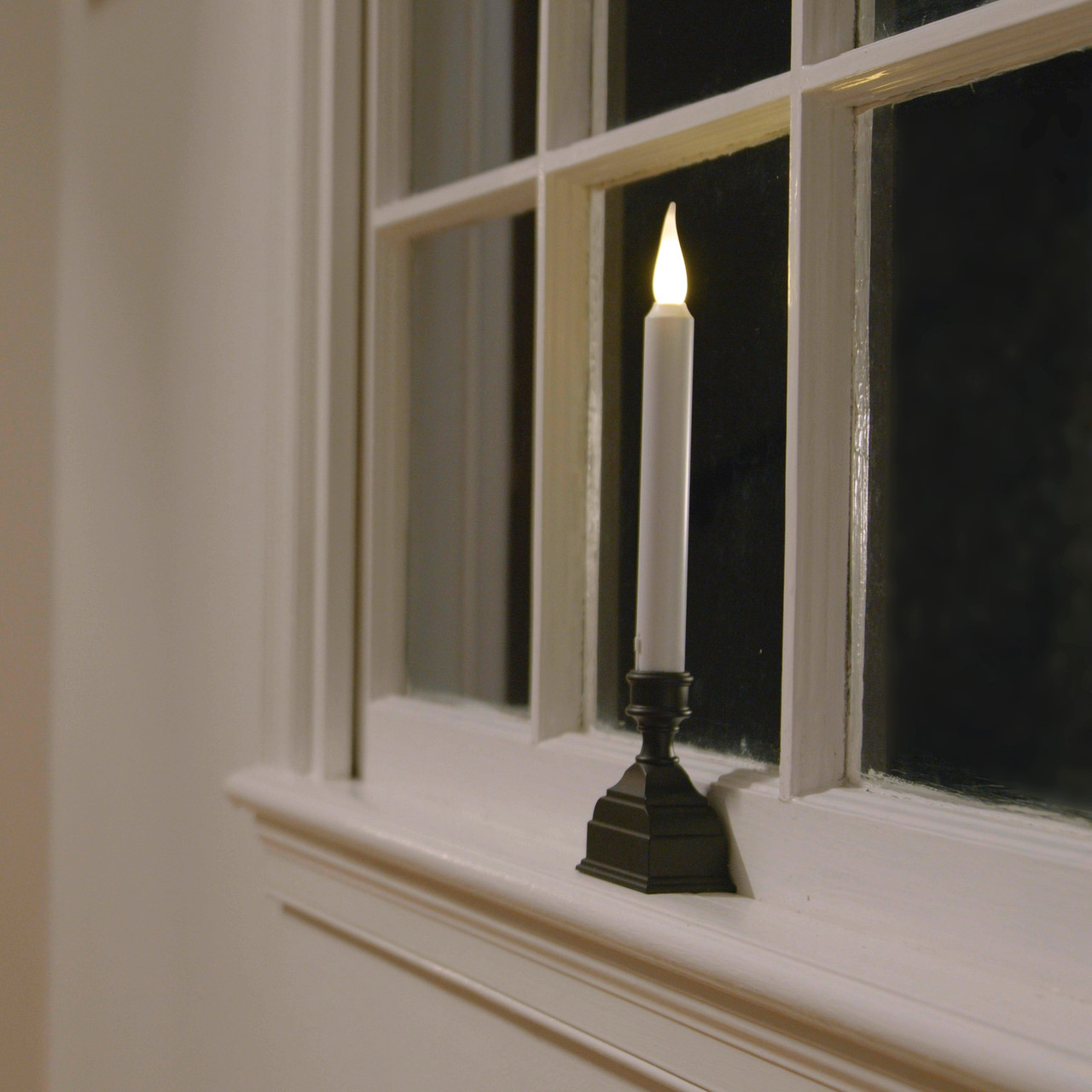 Use during the holidays or year-round with ease. Simply insert 3 AA batteries into the base of the candle, choose your light setting, and place the candle in the window. The built-in automatic light sensor will turn the candle on at dusk (dark) and then turn off 8 hours later, or when light is sensed. This dual sensor/timer function makes it super convenient to use any time of the year. Batteries will last up to 70 days. Made in China. For indoor use only.
