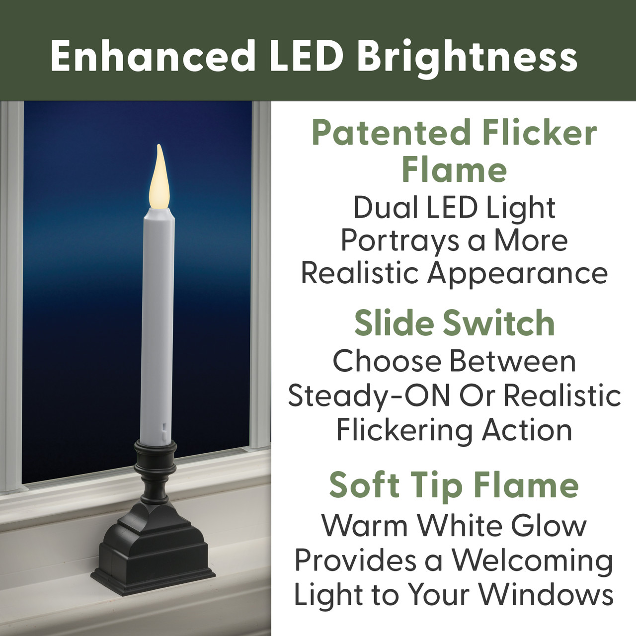 Welcome others to your home with the warm glow of these patented window candles. These candles utilize a dual flame technology where one LED stays on at the base of the light while the other LED at the top of the light moves through a series of motions to create a realistic flickering action. Each candle also feature a steady-on setting where both LEDs are lit all the time.