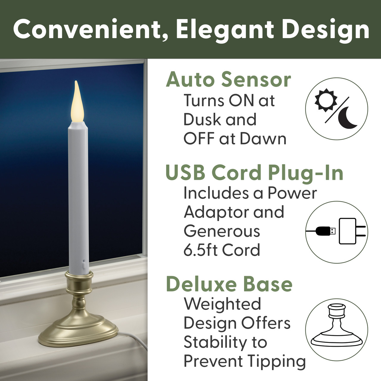 Choose from 2 ON settings (realistic flicker or steady-on). The patented flickering action is the same as several other candles in our line-up. Thanks to dual-LEDs in the flame tip, there is no abrupt jumping of the flame intensity. Simply place in your windows and connect to a power source. Included with each candle is one USB power adapter and a long, 6.5 foot cord. Candles have a built-in, automatic sensor that turns the candle ON at dusk and OFF at dawn. This is a great option for year-round use thanks to this feature!