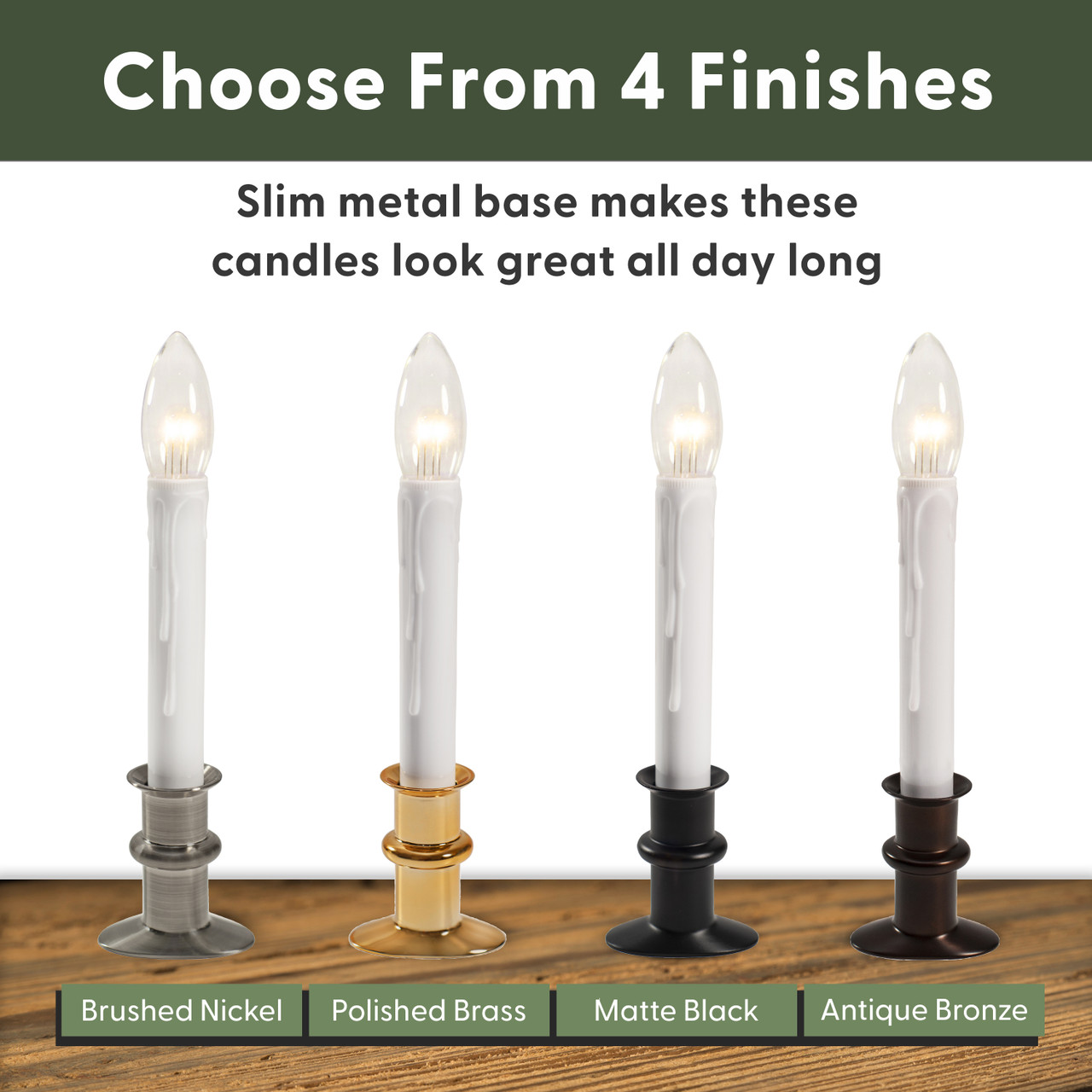 This candle offers many of the same features of our original ultra bright window candle, but with a slender "slimline" metal base. Base only measures 1.5" deep and is weighted to prevent tipping. Available in four finishes. Requires 3 AA batteries, which typically last 30 days (6 hours each day). Made in Taiwan. For indoor use only.