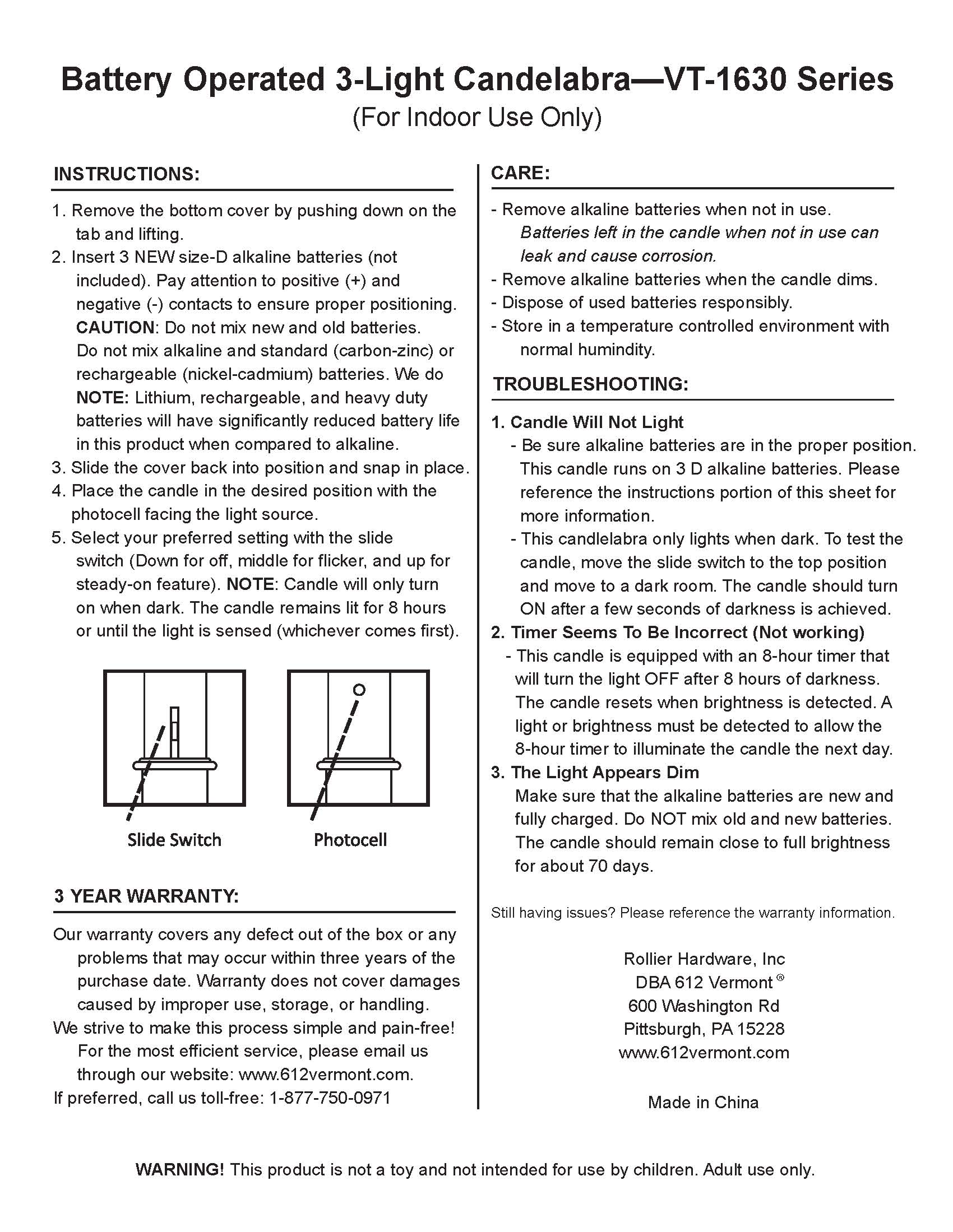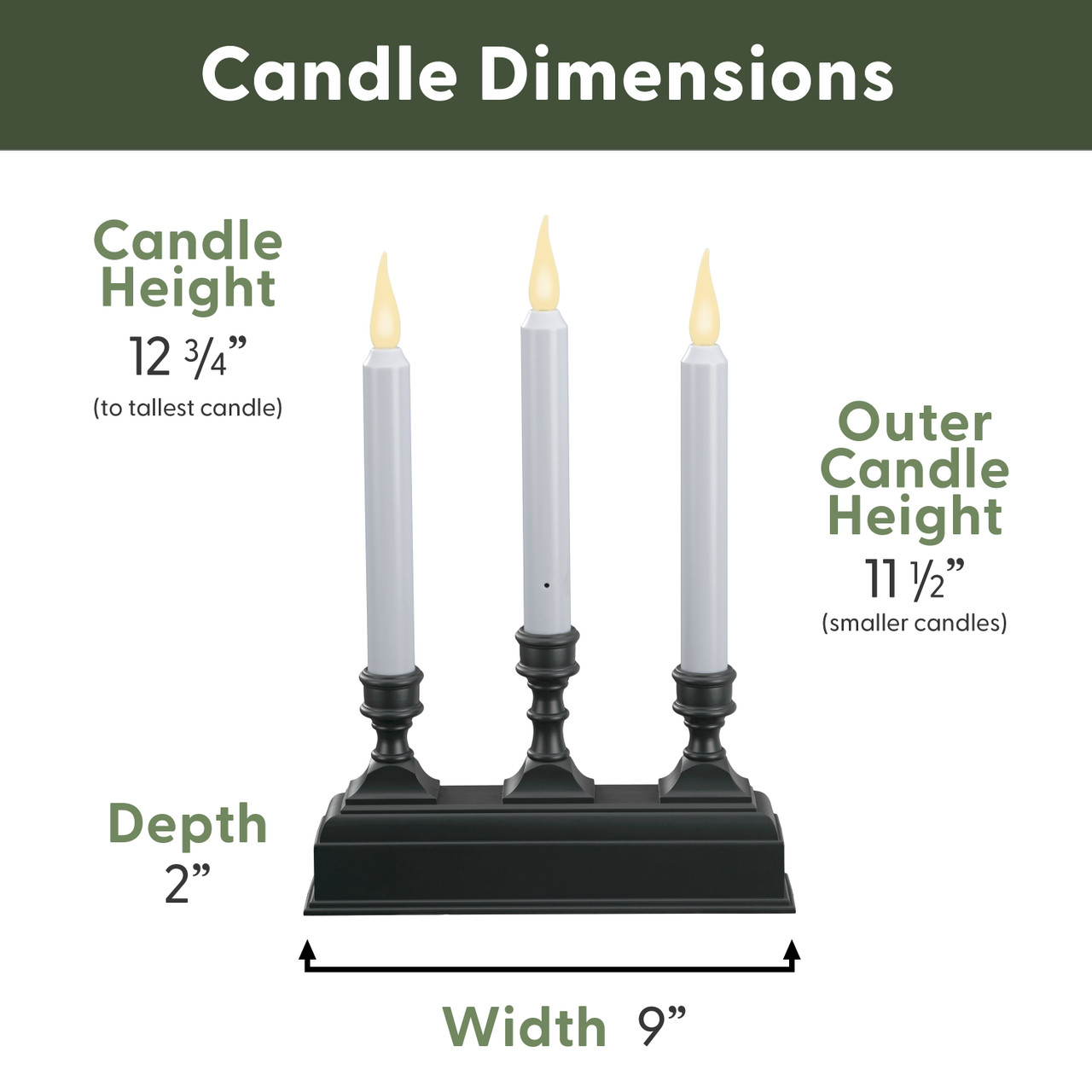 New for 2021, this 3-light candelabra offers the same features of our beloved VT-1620 series single candles, but as a 3 light option! Great for larger windows where a single candle is just not enough. Flame tips have two settings, either realistic flicker or steady-on. Warm white color. Made in China. For indoor use only.