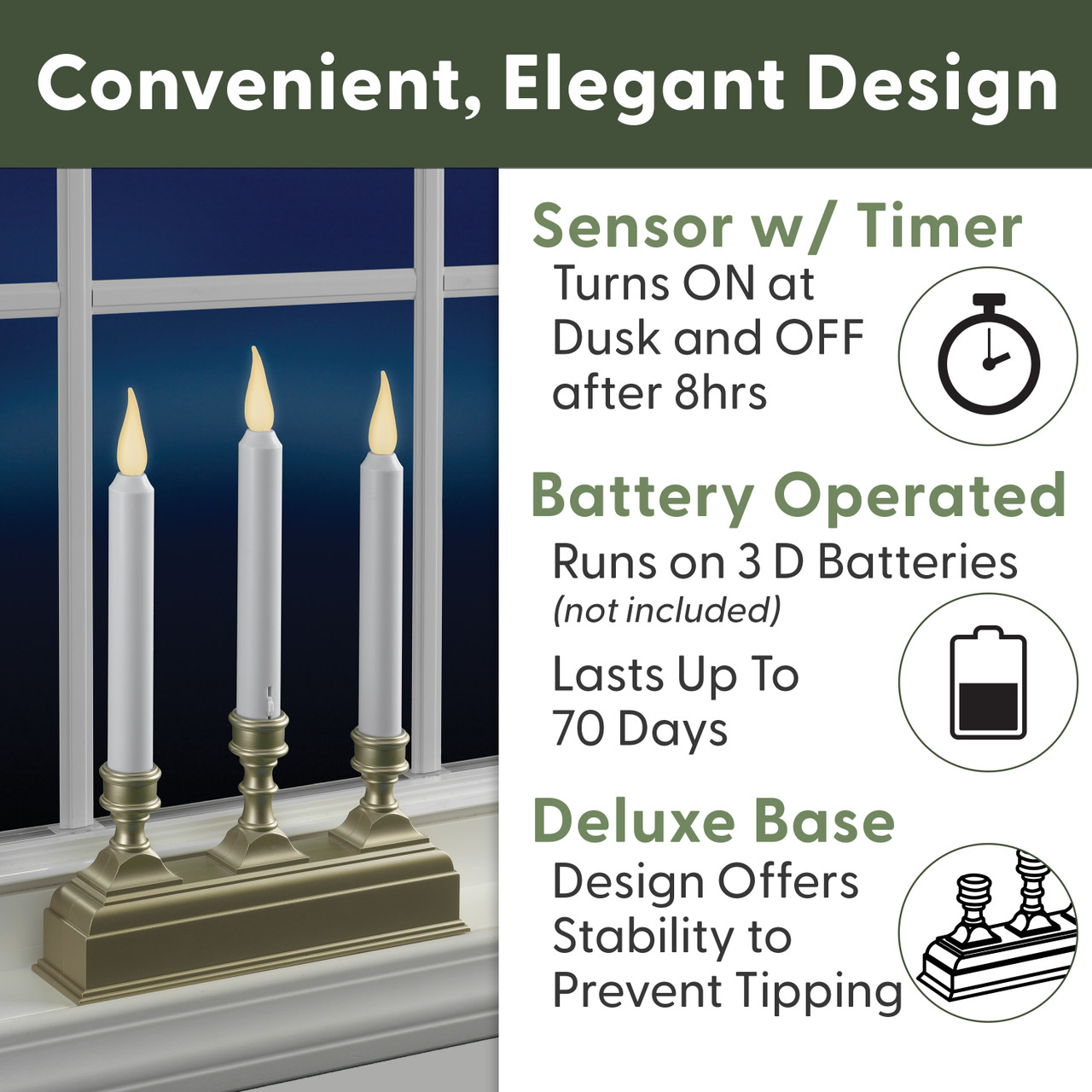 - BATTERIES LAST 70 DAYS: Each candelabra takes 3 D batteries which should last 70 days (Batteries not included).