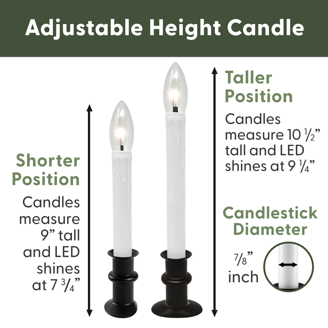 - Total Candle Height: 9 inch (short position), 10.5 inch (tall position)