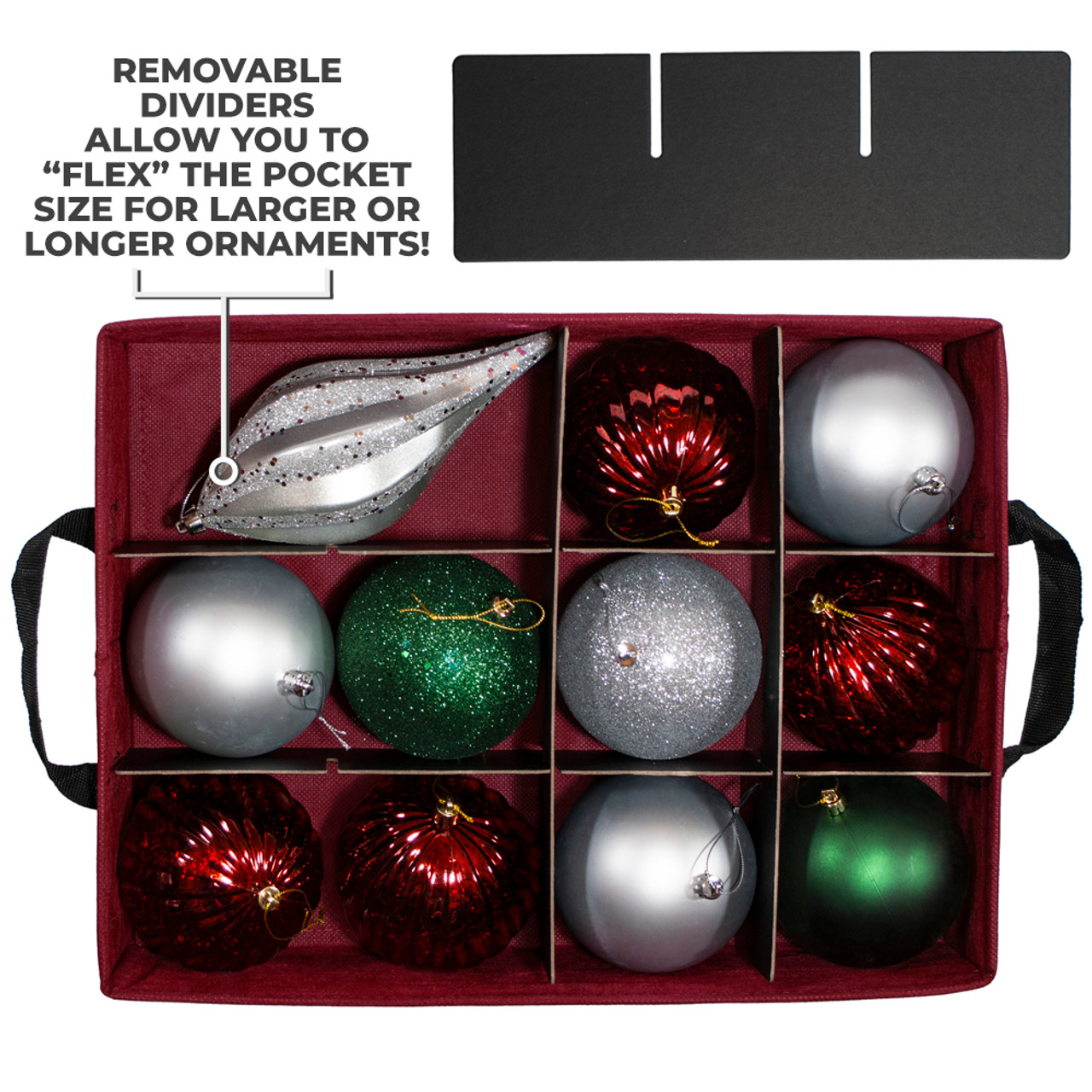 WHEN STORING LARGER ORNAMENTS: If storing even larger ornaments, we recommend removing one or two of the short dividers so that taller compartments can be obtained!