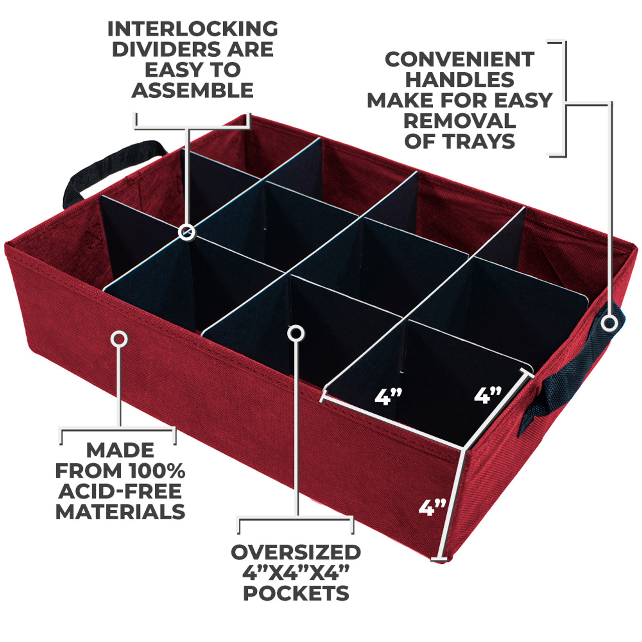 - ACID FREE DIVIDERS: Black dividers designed to prevent damage and discoloration to ornaments.